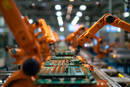 A fleet of synchronized robotic arms working on electronic circuit boards in a high-tech manufacturing plant.. AI Generation
