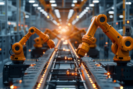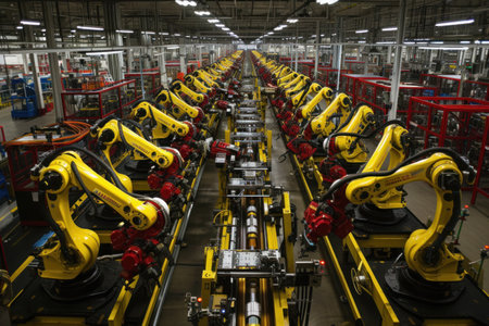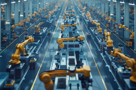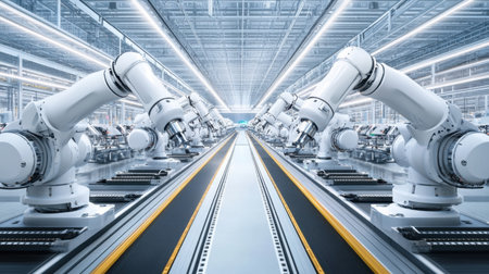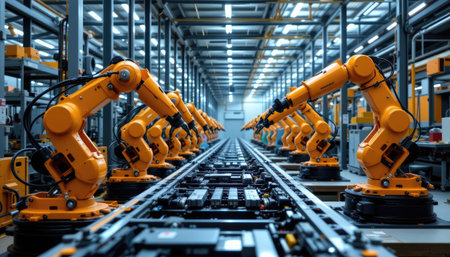 A state-of-the-art manufacturing facility featuring multiple robotic arms working on an assembly line, showcasing advanced automation technology and efficiency.