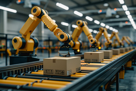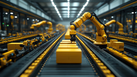 Automated factory conveyor with yellow packages and robotic arms