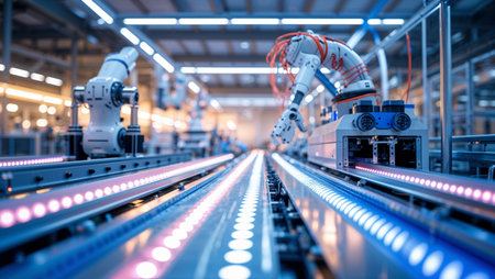 An advanced automated assembly line in a high-tech factory features multiple robotic arms working on a conveyor belt, with illuminated control panels on either side.
