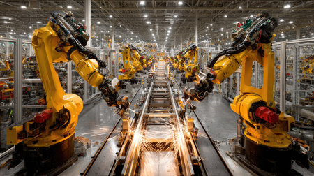 This image captures an advanced manufacturing facility showcasing robotic arms engaged in assembly. Sparks fly as machines perform precise tasks, illustrating modern industrial technology.