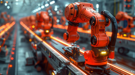 A dynamic scene featuring industrial robots with orange arms actively working on an assembly line in a modern factory. The image highlights advanced technology in manufacturing.