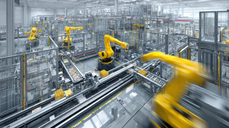 Explore a high-tech industrial factory featuring advanced robotic arms designed for optimal production efficiency and automation. The modern workspace symbolizes innovation.