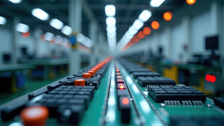 Automated Production Line with Circuit Boards and Control Buttons in Factory, generative Ai