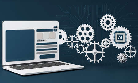 Artificial intelligence web banner. of a processor chip and laptop. The process of data processing. Developments in modern technologies. Microcircuits on neon glowing background. 3D rendering