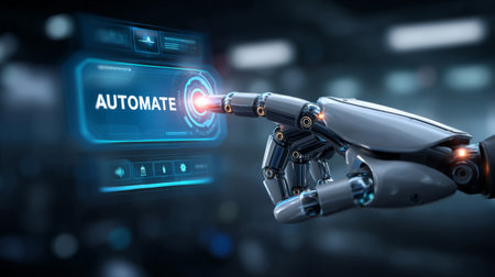 chrome robotic hand pressing control panel icon labeled AUTOMATE with digital factory hologram in background. Generative AI