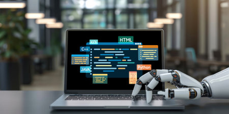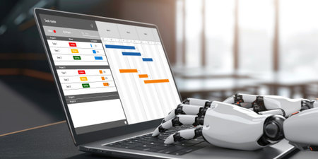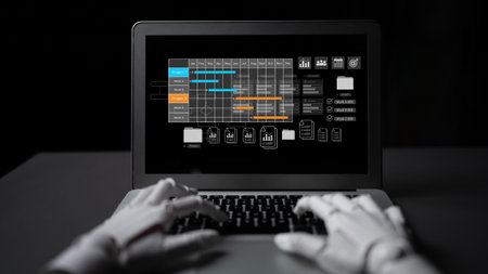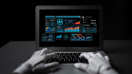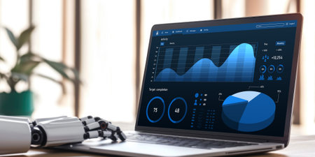 A robotic hand interacts with a laptop displaying dynamic graphs and charts, symbolizing advanced technology in data analysis and automation in a modern workspace.