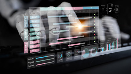 AI managing task workflow system, tracking document progress, analyzing productivity levels, and automating the status flow across structured project stages.
