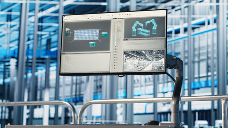 Monitor in industry 4.0 industrial plant used to oversee operation of robotic arms and conveyor systems. Close up of display in smart factory used to monitor system performance
