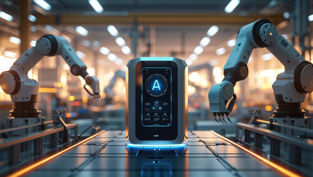 An advanced automated assembly line in a high-tech factory features multiple robotic arms working on a conveyor belt, with illuminated control panels on either side.