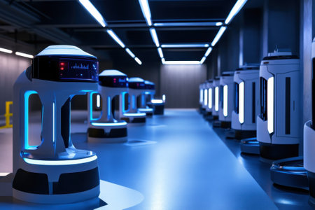 Advanced robotic machines lined up in a modern warehouse, illuminated by blue and white lights.
