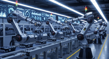 Robotic arms working on an automated assembly line in futuristic factory setting.