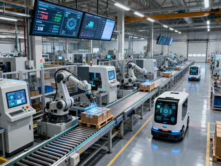 A busy, modern factory floor filled with automated robotic arms, conveyor belts, and AGVs moving along designated paths, showcasing advanced manufacturing processes.