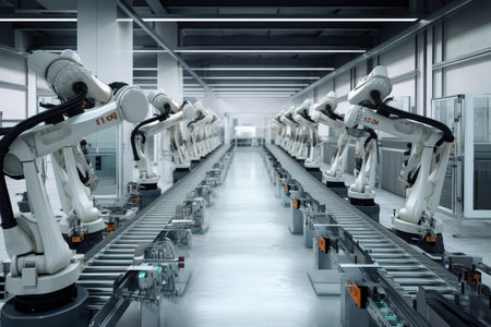 robotic assembly line, with row of identical products being assembled for mass production, created with generative ai