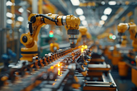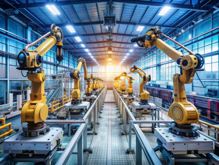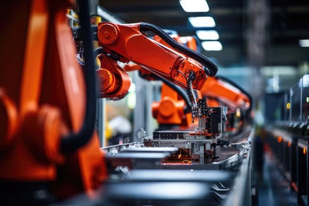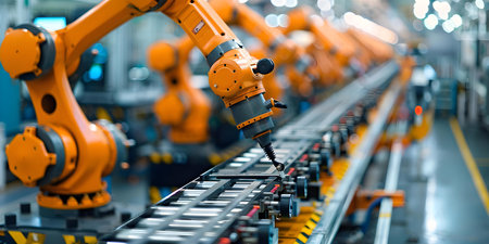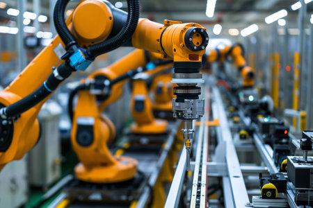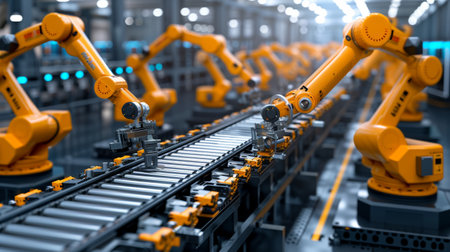 This image showcases advanced industrial robotic arms efficiently working on an assembly line in a modern manufacturing facility, illustrating automation and precision technology.