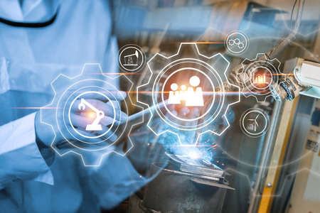 Engineer worker use taplet control robot automatic with industry energy icons, Factory Industry automatic system software. automotive robotics.