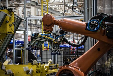 Production line of the robot arm factory. Concept of industrial revolution and automated manufacturing process.