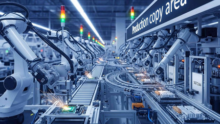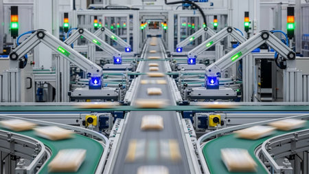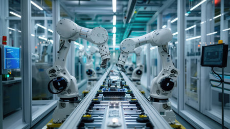 An advanced automated assembly line in a high-tech factory features multiple robotic arms working on a conveyor belt, with illuminated control panels on either side.