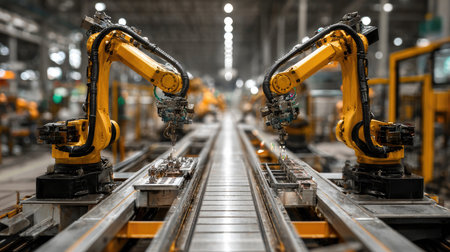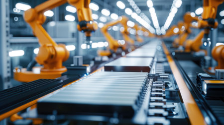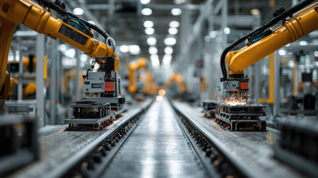 Robotic Arms Factory Automation Assembly Line in Modern Industrial Plant for Automated Production