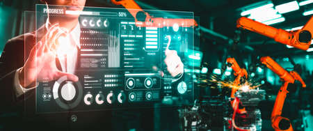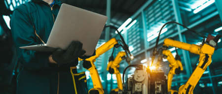 Smart factory worker using computer to control robotic arms. Concept of artificial intelligence for industrial revolution and automation manufacturing process.