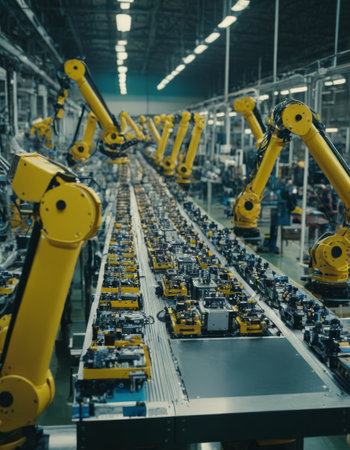 An assembly line in motion, illustrating the precision and efficiency of modern manufacturing