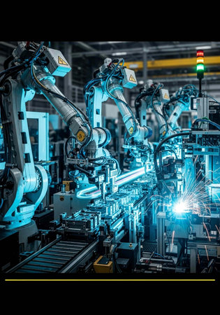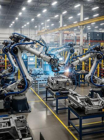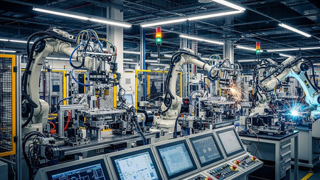 A wide shot of a busy factory floor filled with multiple robotic arms actively engaged in production. Sparks fly from one robot performing welding, while others manipulate components. Control panels with multiple screens and buttons are visible in the foreground, indicating a highly automated and technologically advanced manufacturing environment. Overhead lights illuminate the scene, highlighting the intricate machinery and industrial setting.
