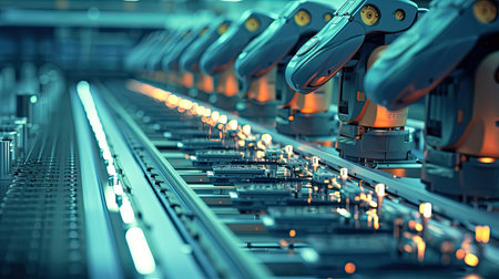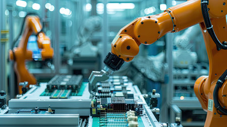 Automated industrial robots assemble electronic devices with precision., generative AI