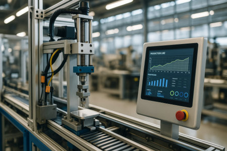 A close-up of machinery in an industrial production line displaying efficiency metrics on a screen