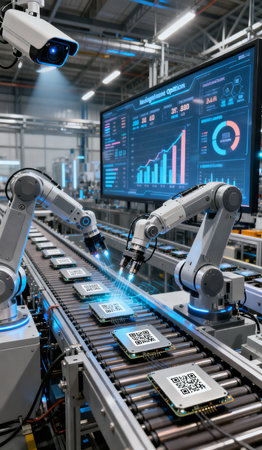 An advanced automated assembly line in a high-tech factory features multiple robotic arms working on a conveyor belt, with illuminated control panels on either side.