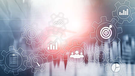 Business process abstract diagram with gears and icons. Workflow and automation technology concept.