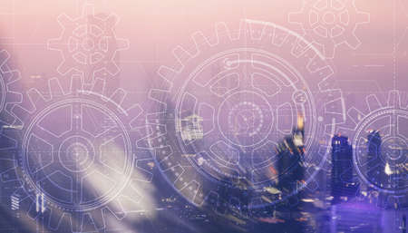 Automation technology and smart industry concept on blurred abstract background. Gears and icons.