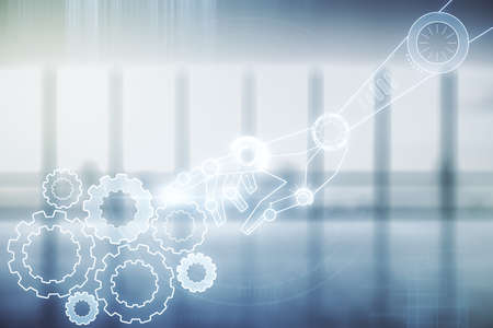 Abstract virtual robotics technology hologram on empty corporate office background. Robot development and automation concept. Multiexposure