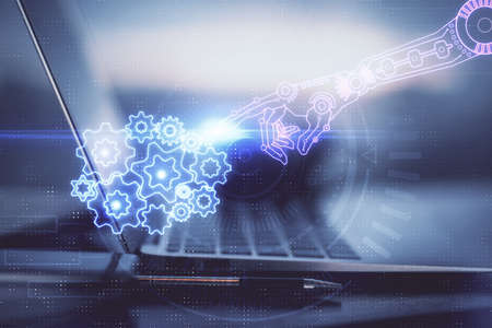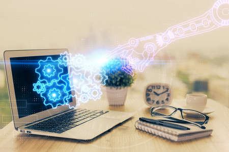 Abstract virtual robotics technology sketch on a modern boardroom background, future technology and AI concept. Double exposure
