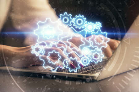 Multi exposure of woman hands typing on computer and business theme hologram drawing. Success concept.