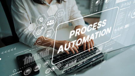 Professional Hands Typing on Laptop with Digital Process Automation Graphics for Business Efficiency and Innovation. Asymptotic smart data analytic.