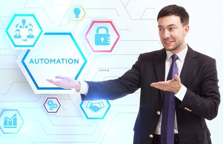 Business, Technology, Internet and network concept. Young businessman working on a virtual screen of the future and sees the inscription: Automation