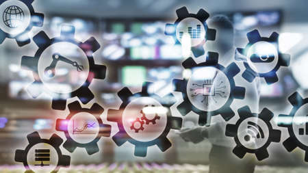 Automation technology and smart industry concept on blurred abstract background. Gears and icons.