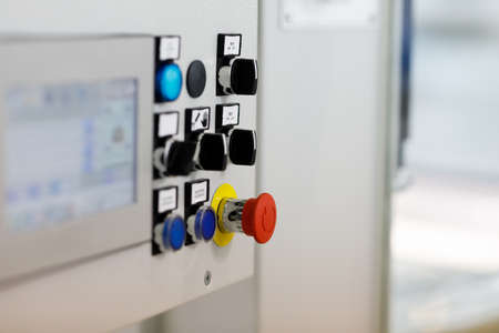 Switches, pushbuttons, and touchscreen on the control panel. Selective focus.
