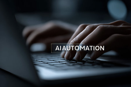 A Hands typing on laptop with search bar displaying AI Automation, showcasing technology and productivity in modern workspace