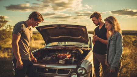 Trio of travelers stranded by the side of the road with a broken-down car