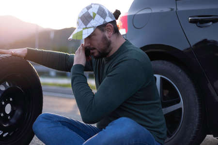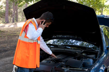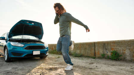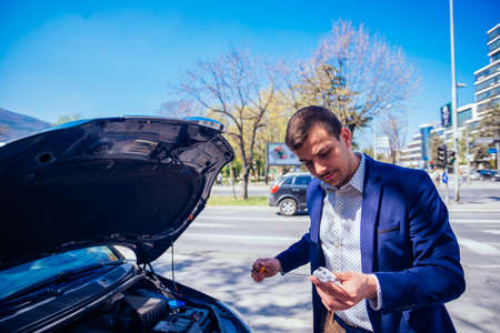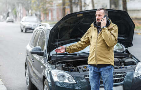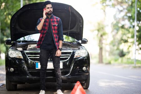 young man calling, texting for car service on roadside assistance after broken car. Car broken, car breakdown concept.