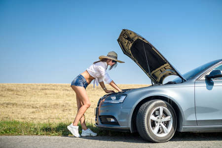 Young Caucasian woman looking at car engine, she doesn't know what to do, car broken down in the middle of the road. Automobile and Roadside Assistance Concept.