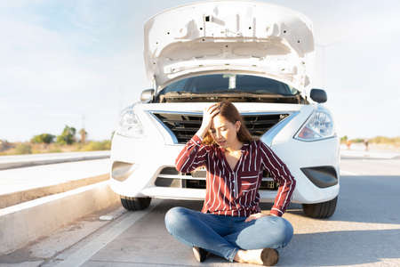 Sad young woman with car trouble sitting in front of her broken-down car with the hood open in the middle of the highway