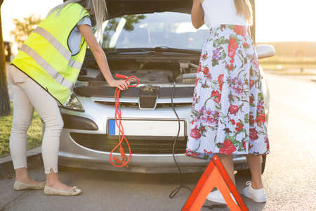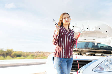 Sad caucasian young woman with a flat car battery looking unhappy holding the jumper cables on the side of the highway