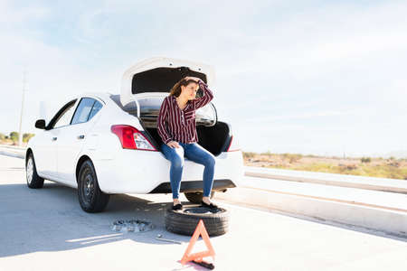 Front view of a pretty young woman sitting on the trunk of her car looking tired. Woman waiting for help to change her flat tire