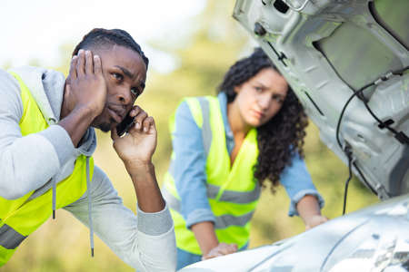 Man looking under the hood of broken car, girl calling car service or assistance in the background