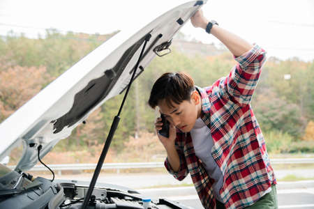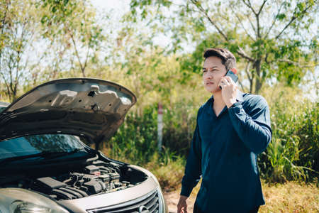 Asian man has broken down car on the road he talking on phone to call someone to help or mechanics car service. Emergency assistance service