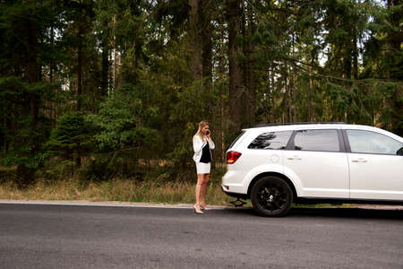 An upset woman stands near her broken car and talking on a cell phone on the road in autumn.