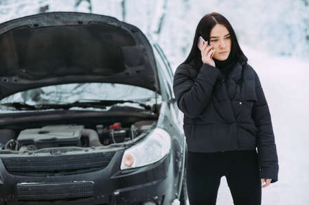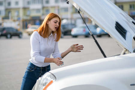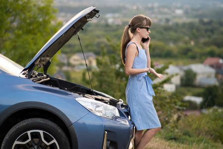 Young woman standing near broken down car with popped up hood having trouble with her vehicle. Waiting for help tow truck or technical support. A woman calls the service center.