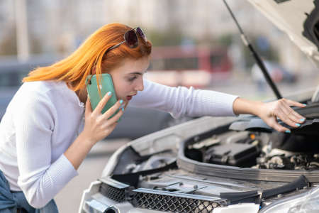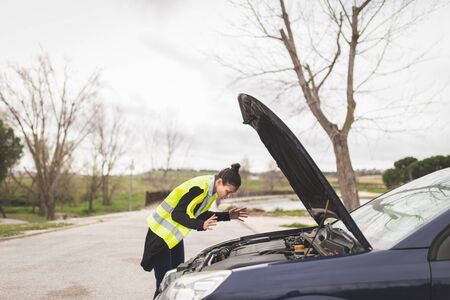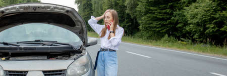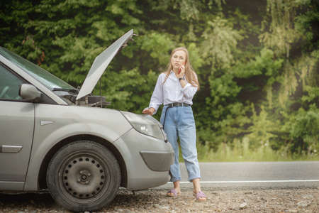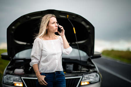 Young woman with broken car calling for help.